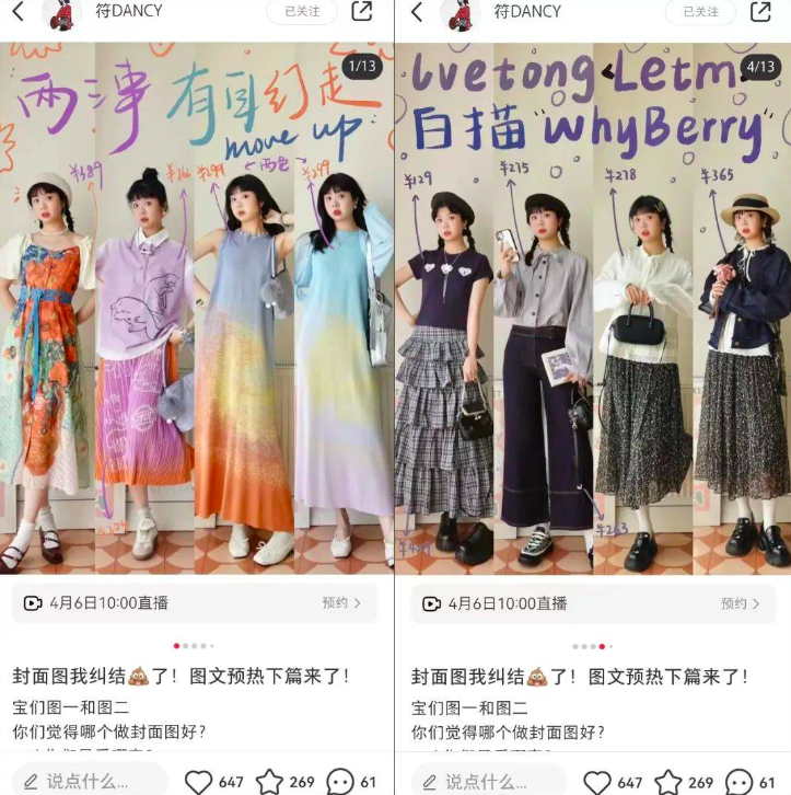 早期,她在小红书做穿搭类分享,会将商品信息整理在视频笔记下。小红书开启直播电商后,@符DANCY 也搭建了自己的直播间,开始高频直播,经常出现在她直播间的品牌包括两三事、有耳、口海、白描等,都是在小红书有着相当声量、活跃于博主种草笔记中的淘宝品牌。